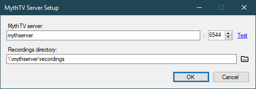 Enter the name (or IP address) of your MythTV server in the first field and the port in the second if you’re not using the default. Use the Test link to verify that it brings you to the MythTV WebFrontend page (it shows the last 10 recordings). Enter the path to MythTV recording files in the third field. This is generally a UNC path (starts with two backslashes) or a path on a mapped drive letter. The directory should contain video (ts or mpg) and screenshot (png) files (MythClient only uses the video files).