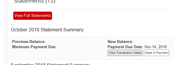 Locate the statement you want in the list. The most recent one will be at the top and already expanded. To download transactions from an older statement, click on it to expand. Click the ''View Transaction Detail'' button. | |||